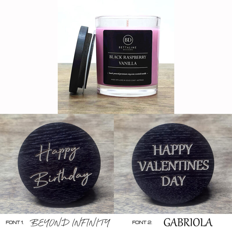 Personalise your candle by having the lid beautifully engraved with your own text. Choose Font 1 or Font 2