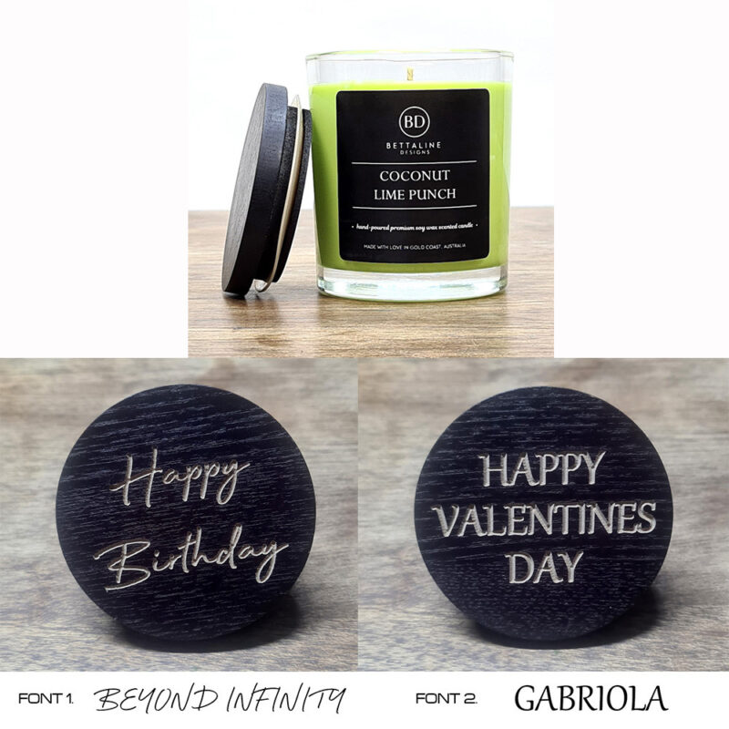 Personalise your candle by having the lid beautifully engraved with your own text. Choose Font 1 or Font 2