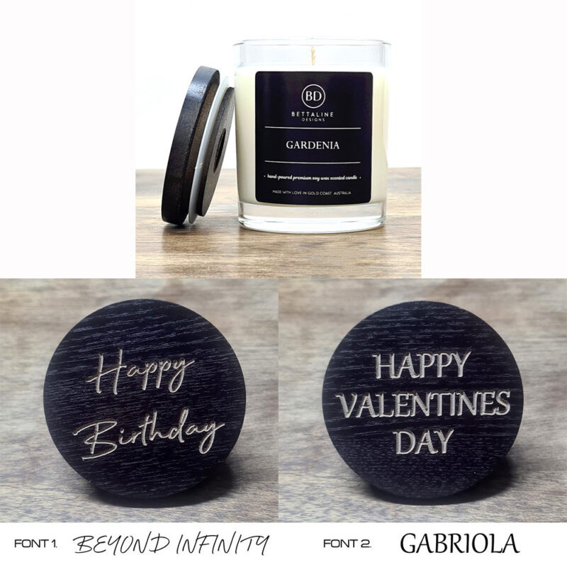 Personalise your candle by having the lid beautifully engraved with your own text. Choose Font 1 or Font 2