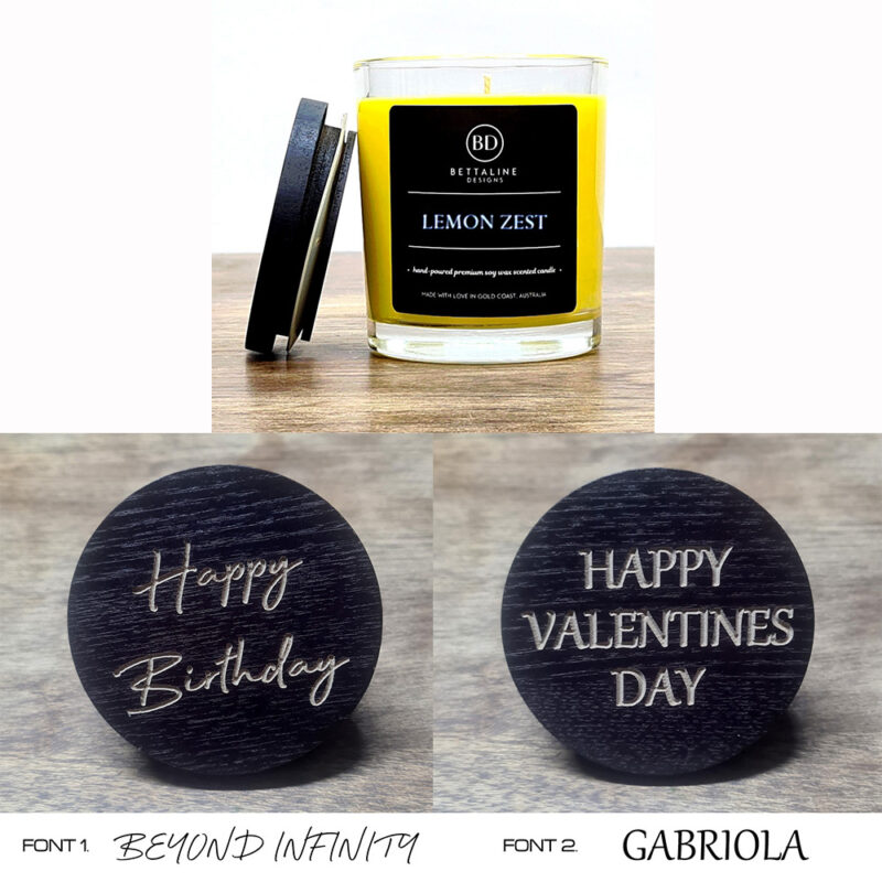 Personalise your candle by having the lid beautifully engraved with your own text. Choose Font 1 or Font 2