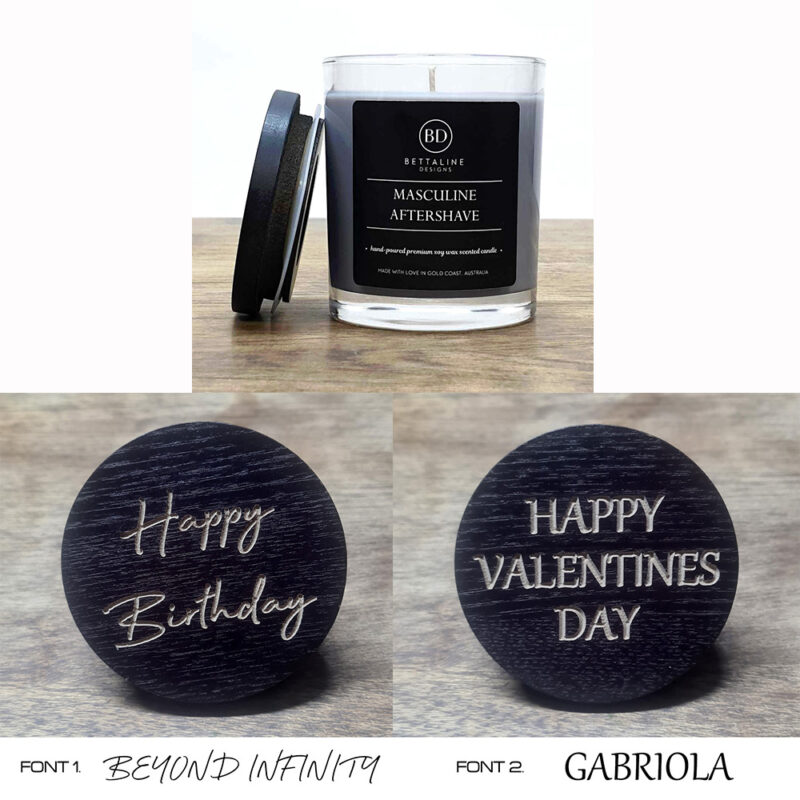 Personalise your candle by having the lid beautifully engraved with your own text. Choose Font 1 or Font 2