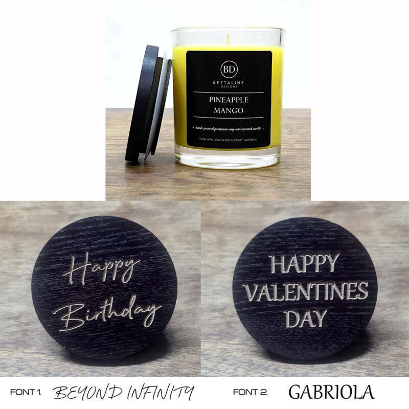 Personalise your candle by having the lid beautifully engraved with your own text. Choose Font 1 or Font 2