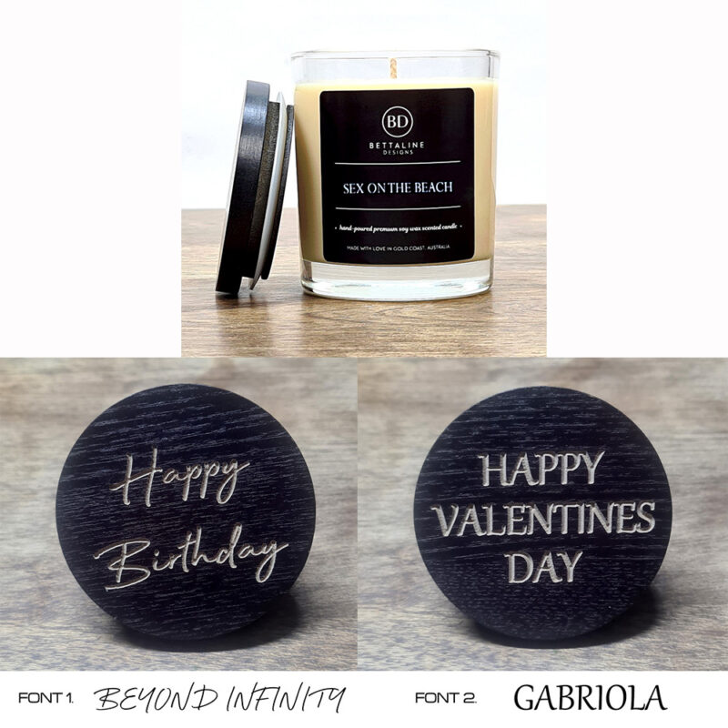 Personalise your candle by having the lid beautifully engraved with your own text. Choose Font 1 or Font 2