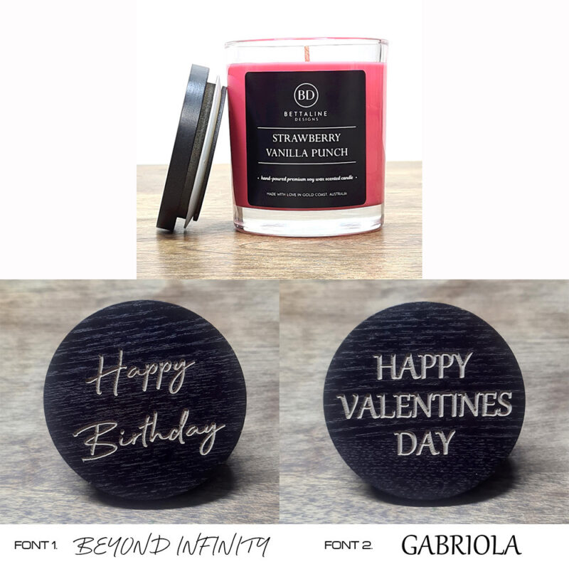 Personalise your candle by having the lid beautifully engraved with your own text. Choose Font 1 or Font 2