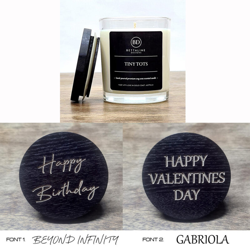 Personalise your candle by having the lid beautifully engraved with your own text. Choose Font 1 or Font 2